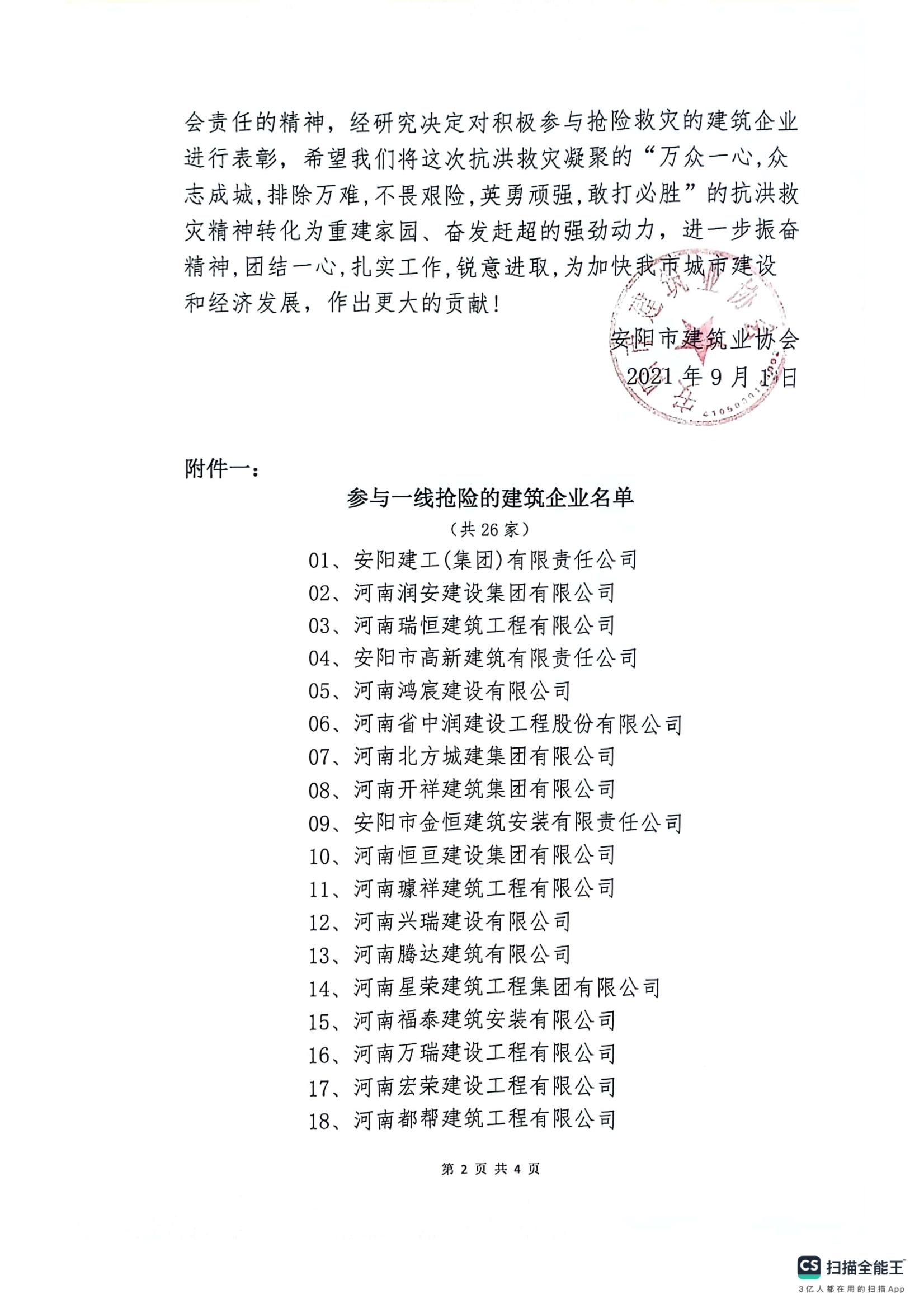 關于表彰‘’7·21‘’安陽特大暴雨洪澇災害中積極參與搶險救災的建筑企業(yè)的決定